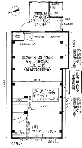 - 元テナント:家具店 店舗部30坪、居宅部7坪 検査済証無し