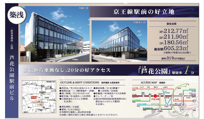 住所 東京都世田谷区南烏山三丁目3-17 建物名/所在階 芦花公園駅前ビル/1~3階 最寄駅 京王線芦花公園駅