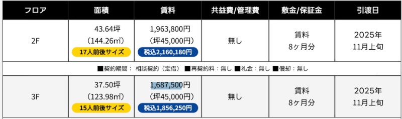 造作価格 ー 賃料(坪単価) 1,856,250円(49,500円) 管理費/共益費(坪単価) ー(ー) 保証金/敷金 8ヶ月 / ー 償却 0% 礼金 0ヶ月 更新料/再契約料 0ヶ月 その他費用 ー 仲介手数料 1ヶ月 その他手数料 ー 契約期間 ー 契約種別 普通賃貸借