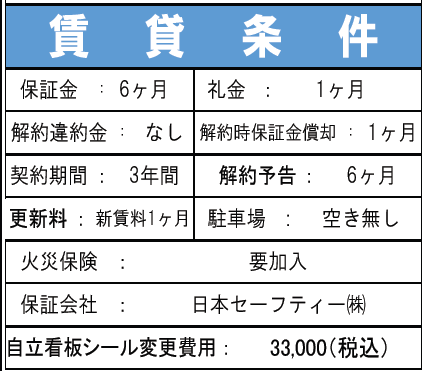 造作価格 ー 賃料(坪単価) 645,700円(12,654円) 管理費/共益費(坪単価) ご相談(ご相談) 保証金/敷金 6ヶ月 / ご相談 償却 1ヶ月 礼金 1ヶ月 更新料/再契約料 1ヶ月 その他費用 自立看板シール変更費用: 33,000(税込) 仲介手数料 1ヶ月 その他手数料 ー 契約期間 3年 契約種別