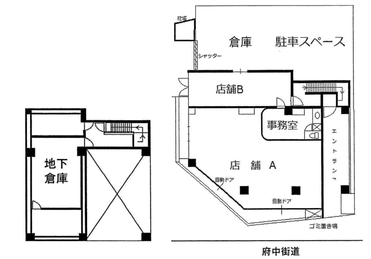 店舗A 115.36㎡、店舗B 39.96㎡、倉庫 43.20㎡