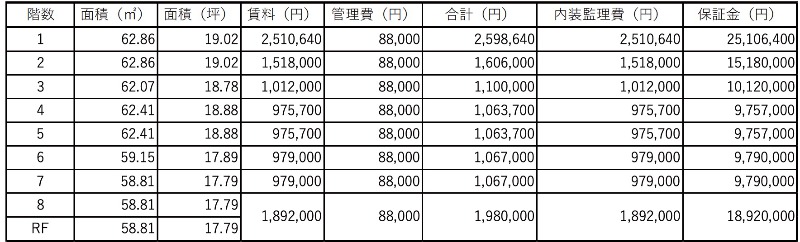 造作価格 ー 賃料(坪単価) 1,518,000円(79,810円) 管理費/共益費(坪単価) 88,000円(4,626円) 保証金/敷金 10ヶ月 / ー 償却 20% 礼金 2ヶ月 更新料/再契約料 1ヶ月 その他費用 ー 仲介手数料 1ヶ月 その他手数料 ー 契約期間 3年 契約種別