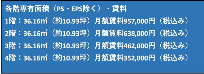造作価格 ー 賃料(坪単価) 957,000円(87,489円) 管理費/共益費(坪単価) ー(ー) 保証金/敷金 2ヶ月 / ー 償却 0% 礼金 2ヶ月 更新料/再契約料 1ヶ月 その他費用 ー 仲介手数料 1ヶ月 その他手数料 ー 契約期間 ー 契約種別