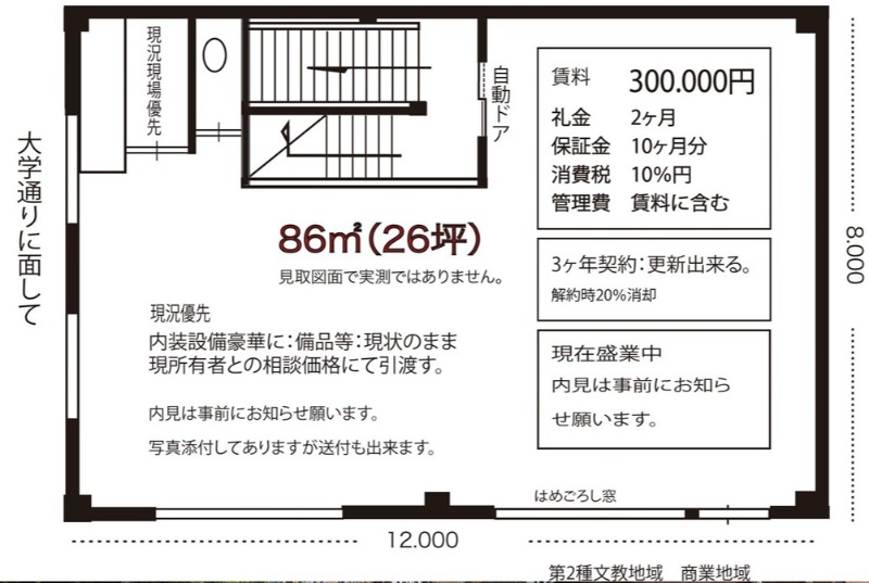 物件の現況 エステ・マッサージ・サロン 可能用途 指定あり 坪数 260.76坪