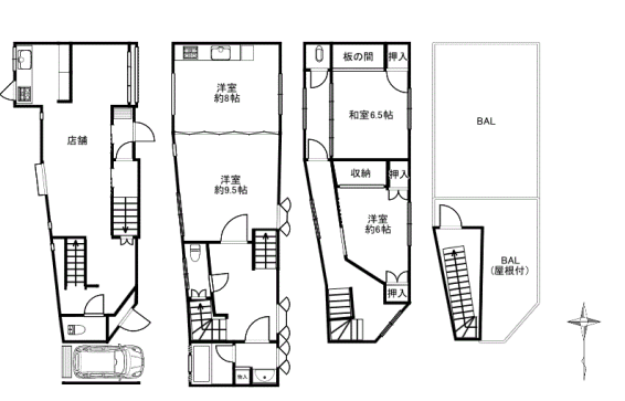 - 1階:飲食店居抜き(約9.56坪)2-3F:住居仕様