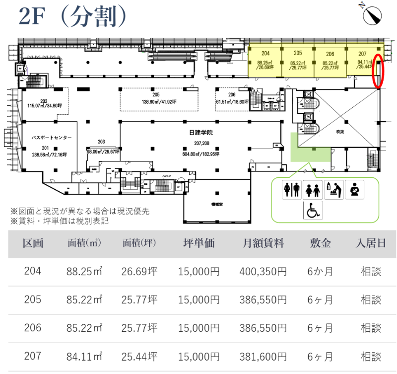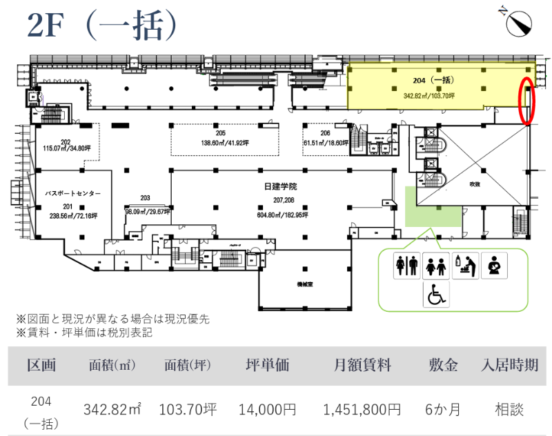 造作価格 ー 賃料(坪単価) 1,596,980円(15,400円) 管理費/共益費(坪単価) ー(ー) 保証金/敷金 0ヶ月 / 6ヶ月 償却 0ヶ月 礼金 0ヶ月 更新料/再契約料 ー その他費用 水道料:月額100円(税別)/坪 仲介手数料 1ヶ月 その他手数料 ー 契約期間 2年 契約種別