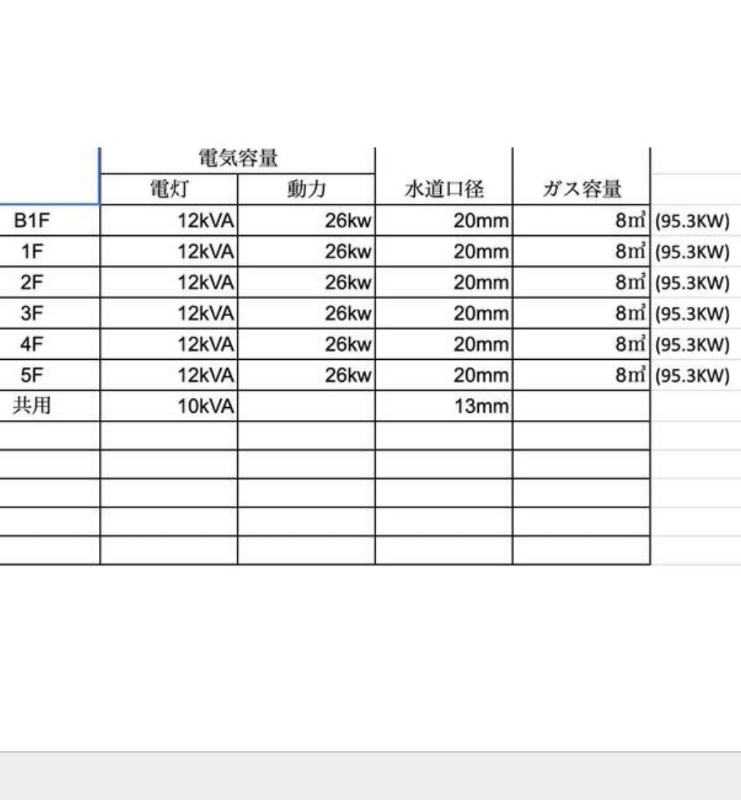 - 水道メーター口径:20mm/ 電気容量(電灯):12KVA/ 電気