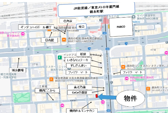 住所 東京都墨田区江東橋三丁目6-10 建物名/所在階 ミカドビル 3F /3階 最寄駅 JR中央・総武線錦糸町駅