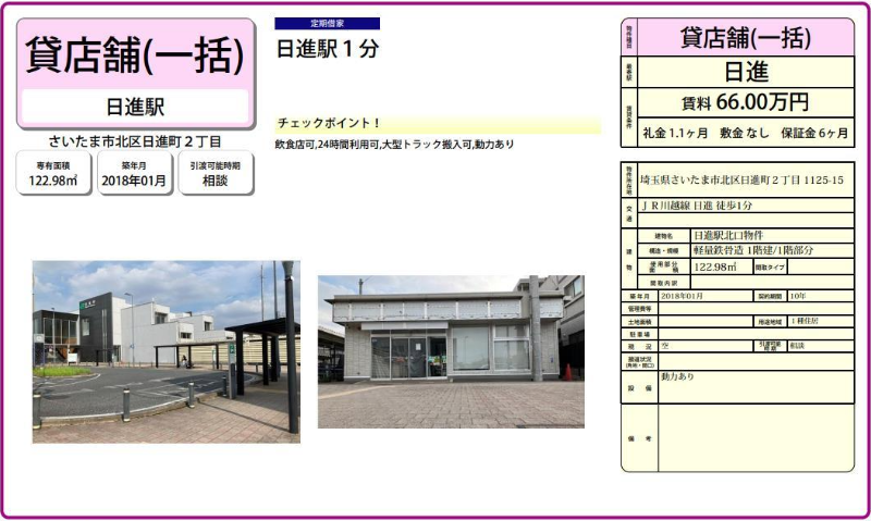 住所 埼玉県さいたま市北区日進町二丁目1125-15 建物名/所在階 ⽇進駅前コンビニ後/1階 最寄駅 JR川越線日進駅